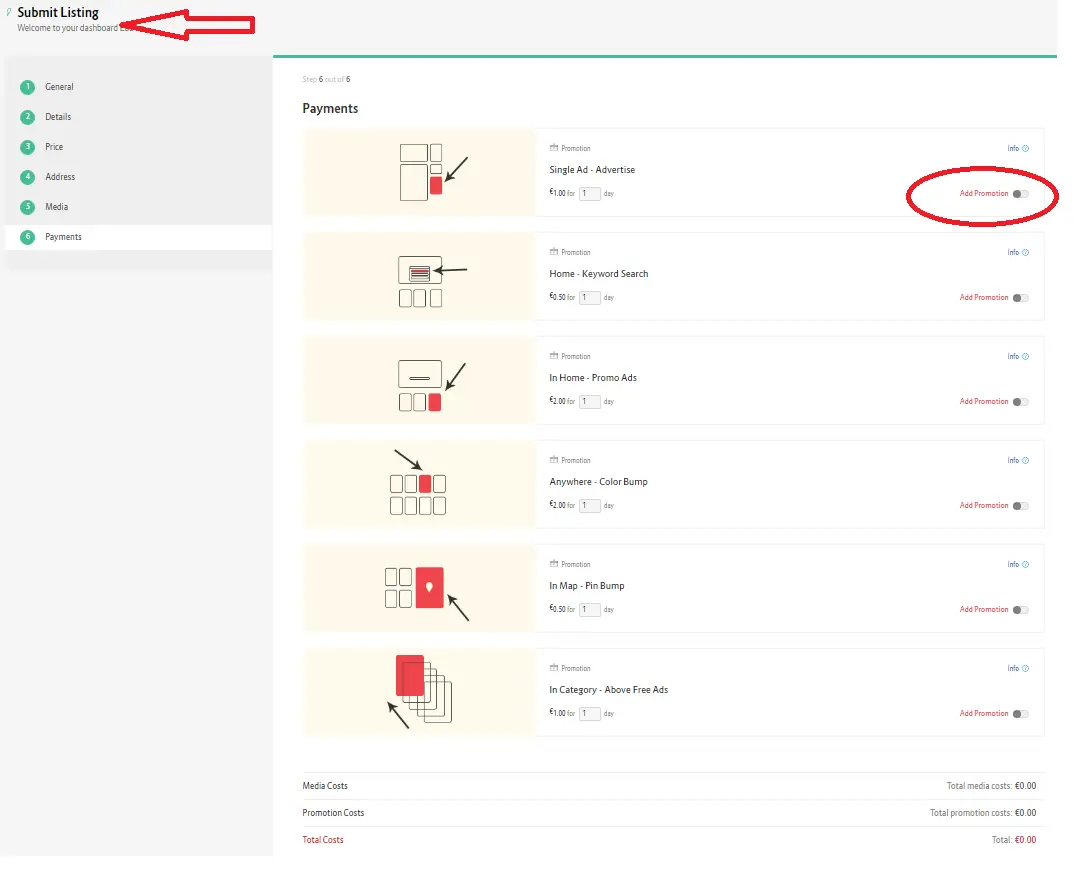 You can add promotions both when you list your ad and at a later time through your dashboard as follows: